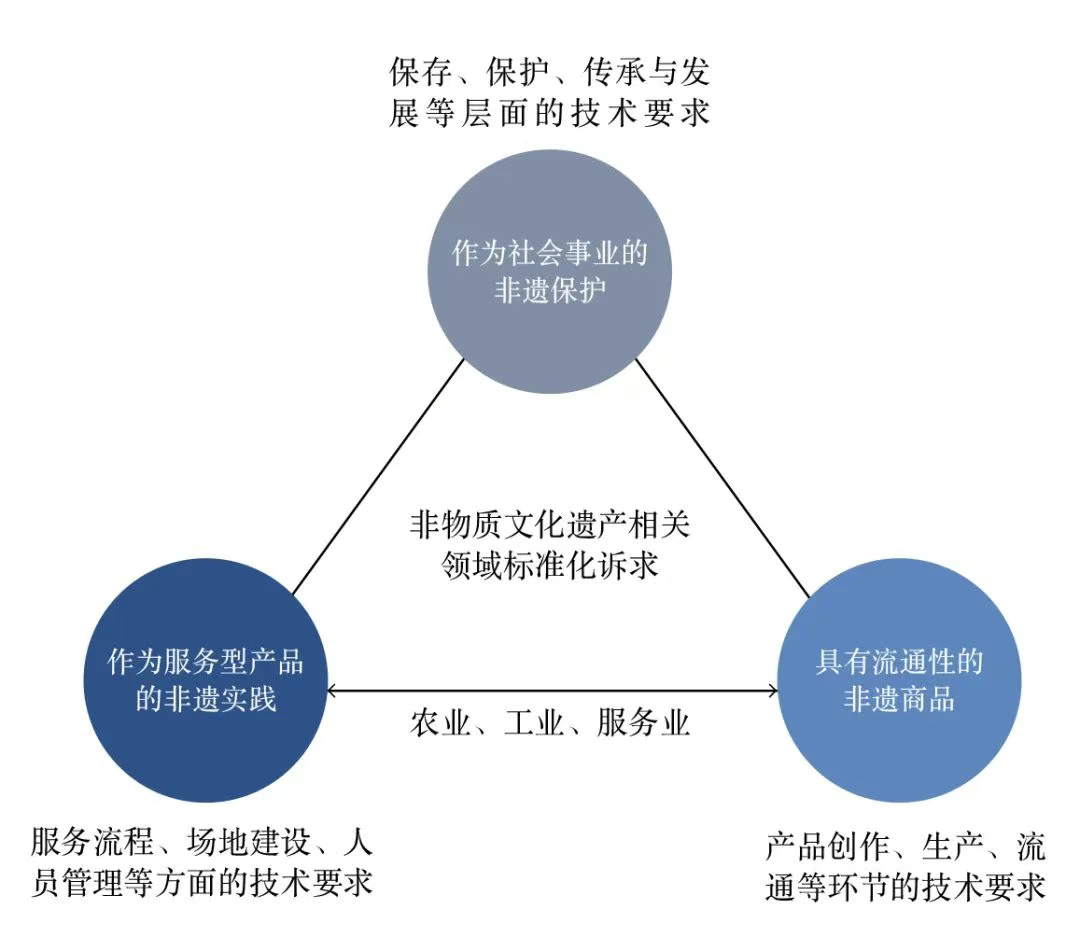 非物质文化遗产涉及人们生产、生活的方方面面,其中一些非遗门类项目的实践成果可输出为产品与服务,因而被纳入农业、工业和服务业范畴,直接通过第一产业、第二产业或第三产业实现传承发展。其一,具有商品性、涉及产品贸易的主要是我国实施生产性保护的非遗门类。为更好地规范这些非遗门类下产品的生产、创作和流通过程,制定行业、企业标准成为一种可选手段。例如,全国工艺美术标准化技术委员会于2022年成立,由中国轻工业联合会筹建并进行业务指导,技术标准范围包括地毯、漆工艺品、花画工艺品、雕塑工艺品、金属工艺品、印染织绣工艺品、编织工艺品、民间民族工艺品等工艺美术领域②。其二,部分非遗门类项目的实践过程以服务型产品的形态存在,比如,归属于传统医药门类的部分医疗服务,或非遗衍生的服务型产品,涉及跨行业实践;再比如,旅游服务、研学服务等。这些服务型产品通常也可从技术层面予以规范管理。其三,非遗保护作为社会文化事业的重要组成部分,在保护管理措施层面也需要统一的技术规范(图1)。
