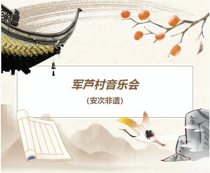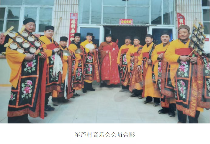 军芦村音乐会分文、武场两部分。通常演奏的编制是10人,文、武场各5人。文场是一根管子、一支笛子、一架云锣、两攒笙;武场是一付钹、一付小镲、一架堂鼓或扁鼓、两付铙。乐师们根据需要把一些古曲加工选择改编成义和团军歌、战歌。
