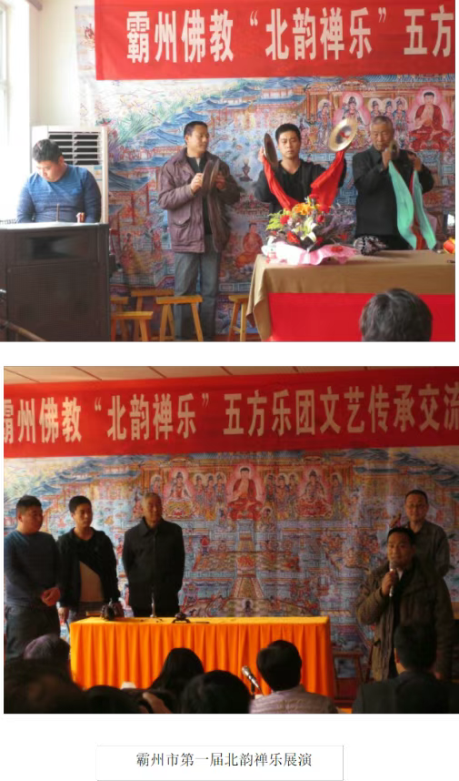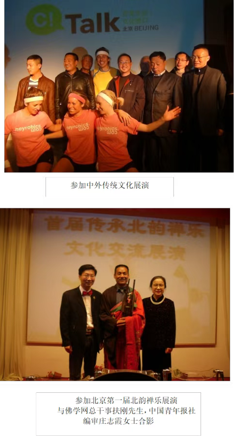 北韵禅乐社通过努力,不但开辟了保护非物质文化遗产的新途径,还吸引了原中国佛教音乐团团长陈杰伟、中华佛学网总干事扶刚、中华文化促进会会长李福河等众多人士前来交流考察,近年禅乐社还联合京津等地的古曲爱好者,共同把濒临失传的北韵瑜伽焰口、观灯焰口录制完毕,并联合中国音乐学院录制北韵禅乐资料,纳入中国音乐学院资料库。期间,受邀到中国文化奥体中心展示北韵禅乐文化,参加北京首届北韵禅乐传承与发展研讨会,联合北京佛教协会,北京京都北韵禅乐社,天津静海砖跺村佛乐会等多家乐社在北京开展北韵禅乐专场演出。并到天津,河北,山东,北京等二十多个地区演出,录制的北韵禅乐节目在中国蓝海卫视,及海外版播出。中国蓝海卫视,中国青年报,长城网,中国佛学网,中国红星网等多家媒体网站给予报道。